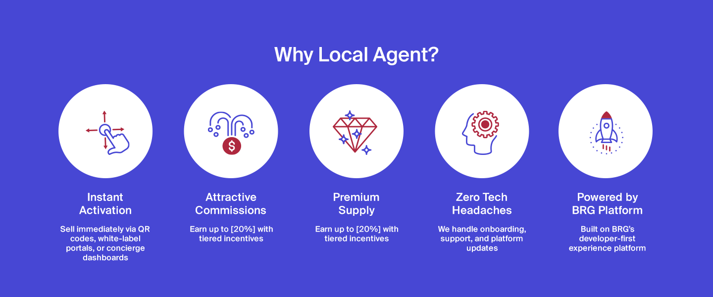 Local Agent is BRG’s scalable B2B storefront solution, designed to empower hotels, tour desks, retailers, and suppliers to sell curated experiences instantly. Whether you’re a concierge desk, visitor centre, retail counter, or supplier supporting third party agents, Local Agent gives you frictionless access to thousands of experiences across Australia and New Zealand—at wholesale rates, with no setup, no lock-in, and full control.